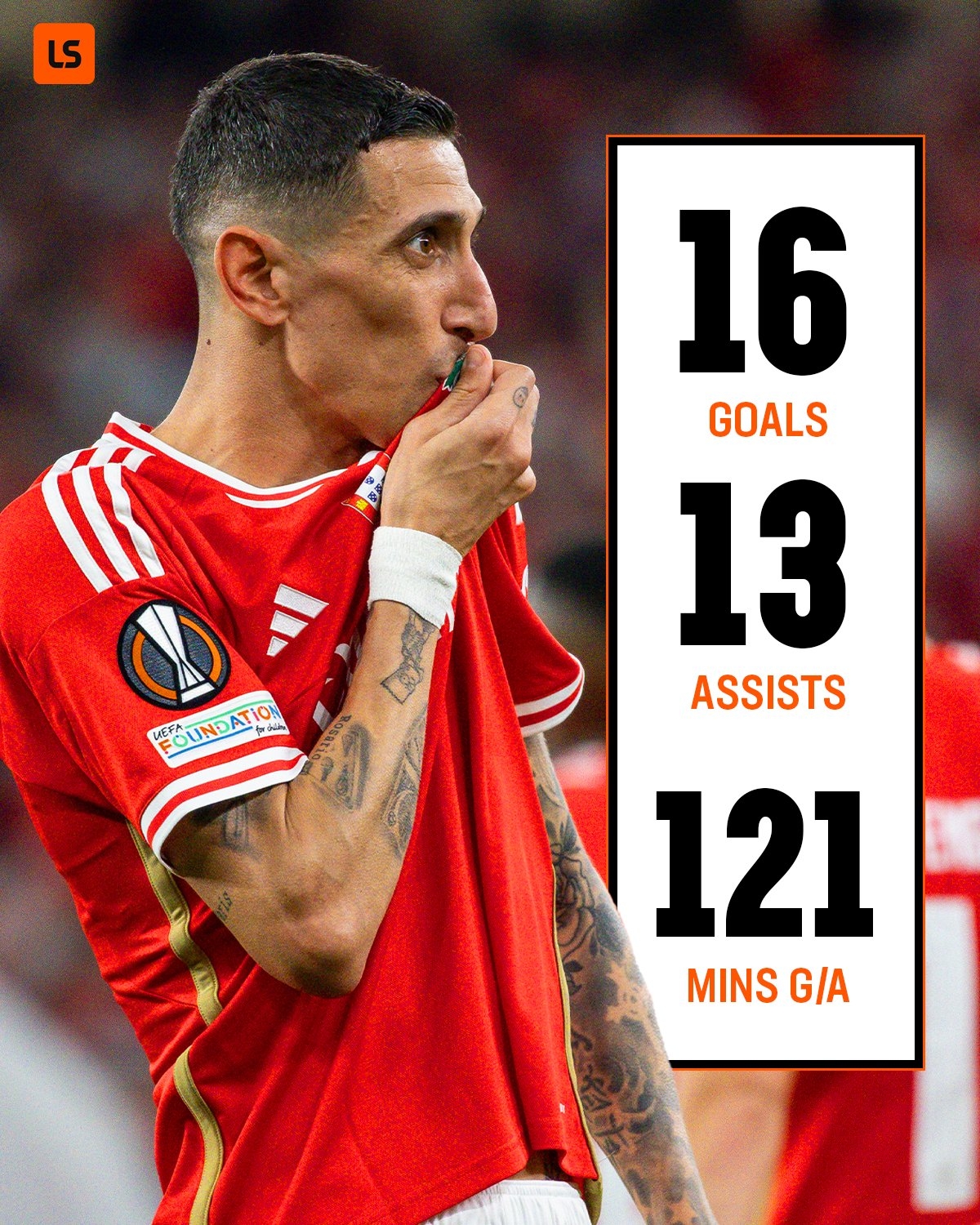 36岁的迪马利亚本赛季为本菲卡打了43场比赛,攻入16球,助攻13次,帮助本菲卡进入欧罗巴联赛8强,葡萄牙超级联赛排名第二,落后葡萄牙体育4分。